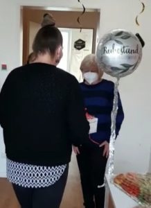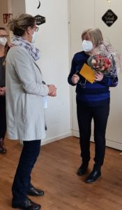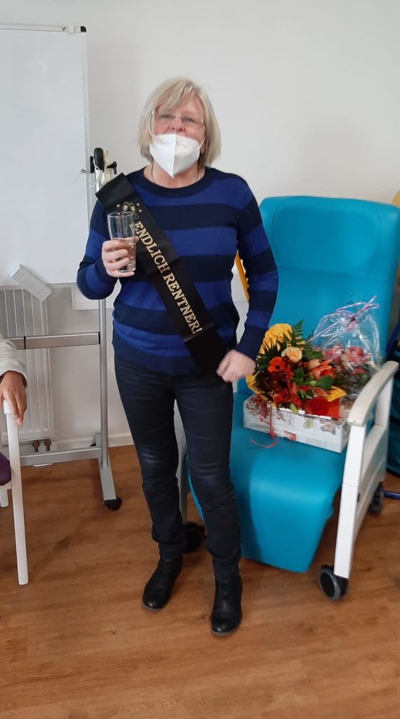 In coronakonformen, kleinem Rahmen (alle Mitarbeitenden geboostert, getestet, mit MNS und bei geöffnetem Fenster) wurde Frau Klementz, für sie überraschend, von ihren Kollegen verabschiedet.