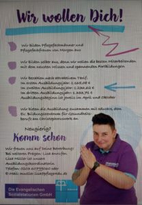 Für uns von den Evangelischen Sozialstationen ist es selbstverständlicher Teil unserer Unternehmensphilosophie an allen unserer drei Standorte selbst auszubilden. Wir stehen für eine qualitativ hochwertige Ausbildung. Denn wir brauchen Mitarbeitende, die das neueste Wissen mitbringen, alternative Ideen einbringen und gemeinsam mit uns unsere Zukunft gestalten. Dabei begegnen wir unseren Auszubildenden immer auf Augenhöhe und orientieren uns an ihren individuellen Bedürfnissen: